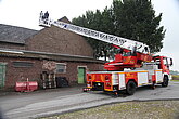 Die freiwillige Feuerwehr aus Willich hat den nötigen Hubsteiger und half dem NABU Willich einen Nistkasten an der Giebelspitze zu montieren.