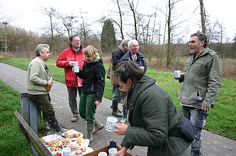 Diese freien Lehmflächen nutzt der Eisvogel, um in die Steilwand eine Nisthöhle zu graben. Die Bruthöhle baut der Eisvogel selbst, sie ist meist ca. 60 bis 80 cm lang und endet in einer etwas größeren Nistmulde. Der Eisvogel ließ es sich nicht nehmen, ein paar Mal in der Nähe der "Baustelle" vorbeizufliegen, als wenn er sagen wollte "Was wird denn hier gebaut?