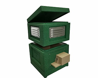 Der Nistkasten wird von Erdhummeln gerne angenommen. Aber auch Acker- Wiesen und Baumhummeln gründen gerne in so einem Nistkasten ein Volk. Weitere Informationen zum Nistkastenbau erfahren Sie unter http://www.das-hummelhaus.de Gegen Ende der Hummelsaison im Hochsommer ,werden die Jungköniginnen und Drohnen (männliche Hummeln) geboren. Die Drohnen legen auf sogenannten Schwarmbahnen Duftspuren an und begattungswillige Jungköniginnen werden von diesem Duft angezogen, um sich an diesen Plätzen begatten zu lassen. Um gut über den Winter zu kommen fressen die Jungköniginnen sich noch ein ordentliches Polster an um dann ein Überwinterungsquartier unter Moos, Laub oder bis zu 30cm in der Erde zu suchen. Die Drohnen sterben einige Zeit nach dem Hochzeitsflug, denn ihre Aufgabe der Befruchtung ist getan. Viele Königinnen überleben den Winter nicht, aber diejenigen die es schaffen gründen im nächsten Frühjahr neue Völker, sofern sie in unserer aufgeräumten Landschaft eine Nistmöglichkeit finden. Jeder von uns kennt Hummeln und wir sind vom Fleiß dieser Teddys der Lüfte begeistert. Nistkästen bieten eine sehr gute Möglichkeit diese Insekten aus der Nähe kennen zu lernen. Man kann nur schützen was man kennt und gerade Hummeln leisten in unserem Ökosystem einen wichtigen Beitrag. (Video Hummelnistkasten)