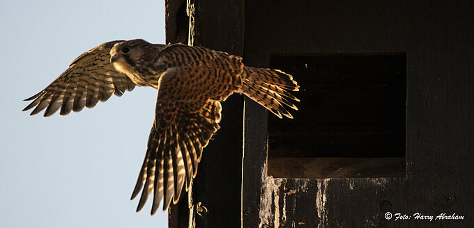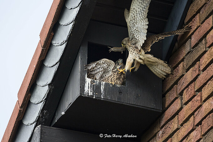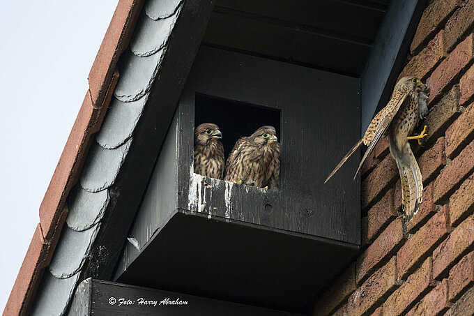 Seit vielen Jahren beobachte ich wie Turmfalken auch in dieser Höhe Nistkästen annehmen und erfolgreiche Bruten hervorbringen. Dachbodenluken oder Gebäudenischen gibt es viel zu selten. Der allgemeine Trend zu dichten Häusern und Taubenabwehrsperren lässt vielen Vögeln keine Chance einen Brutplatz zu finden.