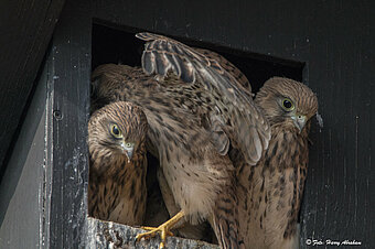 Später während der Fütterungsphase Ende Mai Anfang Juni ist diese Ruhe nicht mehr nötig, dann sitzen die Jungfalken schon ganz selbstbewusst im Nistkastenfenster und warten auf Futter von beiden Altfalken. Jungfalken untereinander sind im Nistkasten kaum aggressiv, doch wenn der Nistkasten zu klein, oder das Gelege zu groß ist, kommt es schon mal vor, dass ein Jungvogel rausgeschmissen wird.