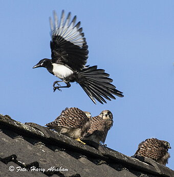 Zur Zeit der Brutphase im Mai reagieren die Falken auf Störungen empfindlich, so dass man darauf achten sollte, ihnen dann die nötige Sicherheit und Ruhe zu geben. Das Männchen sorgt jetzt meistens für die Versorgung des Weibchens, denn ein Verlassen des Geleges ist zu gefährlich. Dohlen oder andere Rabenvögel würden sich gerne die leckeren Eier schmecken lassen. Das Weibchen macht nach dem verspeisen der leckeren Mahlzeit erstmal einen Verdauungsflug und das Männchen sorgt dann für die Sicherheit des Nestes. Doch der Flug dauert nicht lange und das Weibchen kehrt zum Nest zurück um das Gelege zu bebrüten.