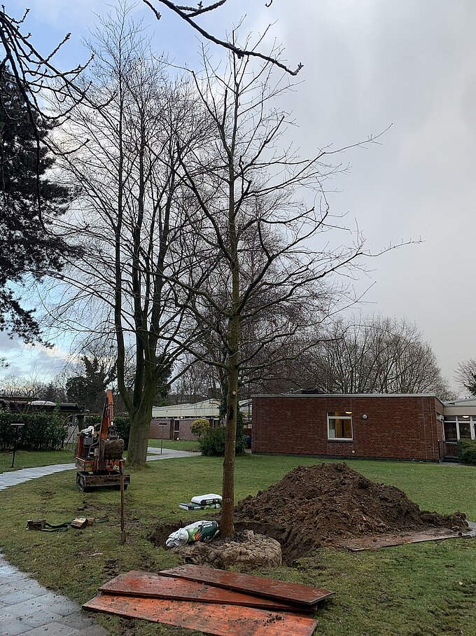 Auf Initiative des Handballvereins Adler Königshof wurde auf dem Gelände der Markuskirche in Fischeln eine 8 Meter hohe Stieleiche gepflanzt. Finanziert wurde der Baum durch eine Spendensammlung von Mitgliedern des NABU und des Handballvereins: An einem einzigen Konzertabend in der Markuskirche im vergangenen Jahr spendeten die anwesenden Fischelner Bürger und Vereinmitglieder von Adler Königshof die stolze Summe von 1000 €! Die Firma Timberland Finance steuerte daraufhin zusätzlich 500 € für die Pflanzung bei. Am vergangenen Mittwoch pflanzte Thomas Meerkamp von der Baumschule Heilmannshof die Eiche mit schwerem Gerät an der Markuskirche. In den nächsten Monaten wollen die Kinder der Kita der Markuskirche den Baum regelmäßig gießen und pflegen, damit er gut anwächst.