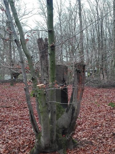 Der von einem niedrigen Wall umgebene historische Buchenkamp, auf dem noch die alten Stockbuchen stehen, wurde heute in historischer Weise bearbeitet. Markus Rotzal vom NABU Arbeitskreis Wald und Baumpflege und seine Mitarbeiter hatten einen Teil der Stockbuchen eingekürzt und damit wieder in Form gebracht.