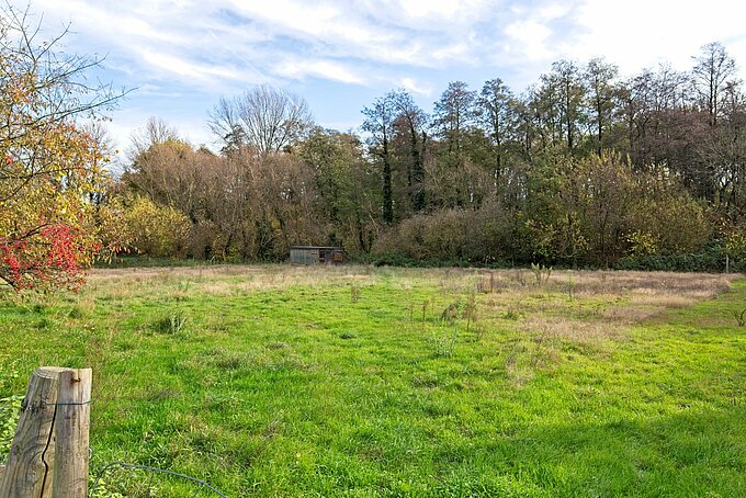 Die südliche Fläche wurde bis vor etwa einem Jahr als Schafsweide genutzt, eine gut erhaltene Stallung bietet Weidetieren Schutz. Wir möchten diese Fläche auch wieder beweiden und haben bereits mit einem Schäfer die nächsten Schritte abgestimmt.