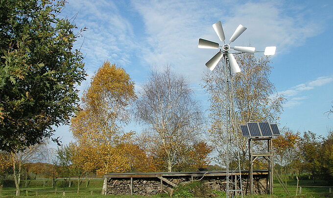 Der Blick über die Feuchtwiese zeigt: Auch am Naturschutzhof versuchen wir, erneuerbare Energiequellen so gut es geht zu nutzen. Seit Kurzem verfügen wir auch über eine solarbetriebene Ladestation für Mobiltelefone.